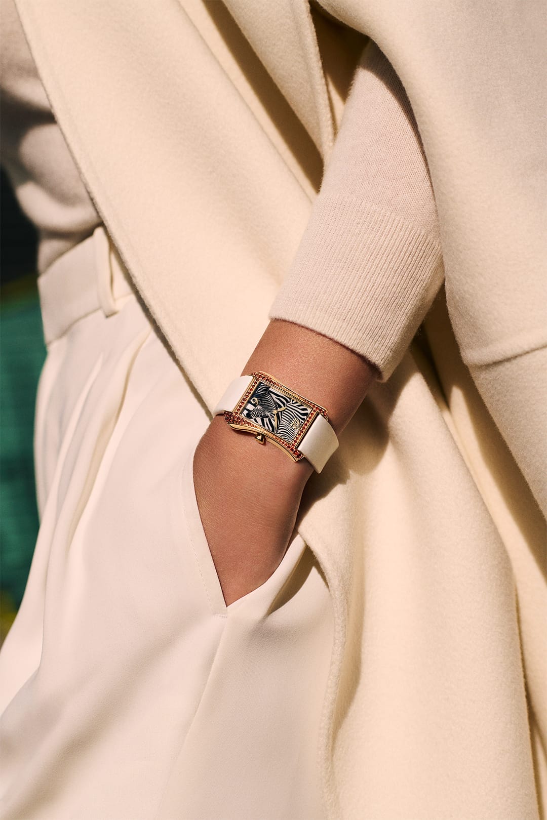 For a grand dame such as Patek Philippe, the Gondolo Serata “Zebra” is bold yet refined, structured yet instinctive, and a metaphor for contemporary femininity. Within the decorated sapphire dial, Patek Philippe’s emblem hovers between transparency and mystery, much like the way art blurs the line between what is seen and felt.