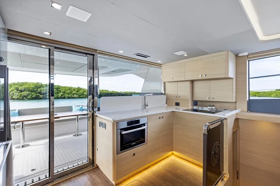 The aft full-featured galley is equipped with a full-size American-style fridge, microwave, convection oven and a large ‘country’ stainless steel sink – with a covering to transform into a countertop – and is joins the rear cockpit through a large door and fold-down windows.