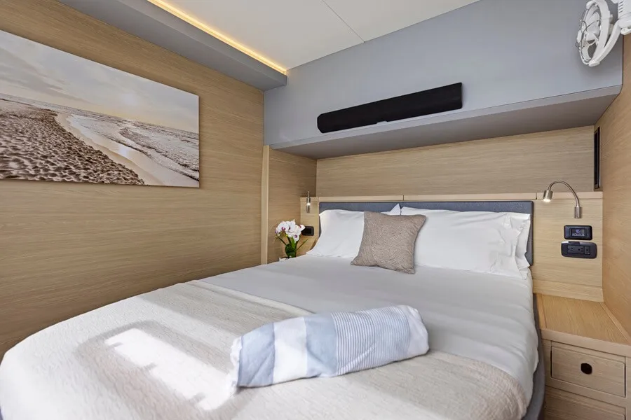 The suite also has excellent storage space, thanks to the cat’s pontoons, which let owners stow not only personal items but also gear and even a mattress for the saloon table, stored below the floor. The closet space is also decent.