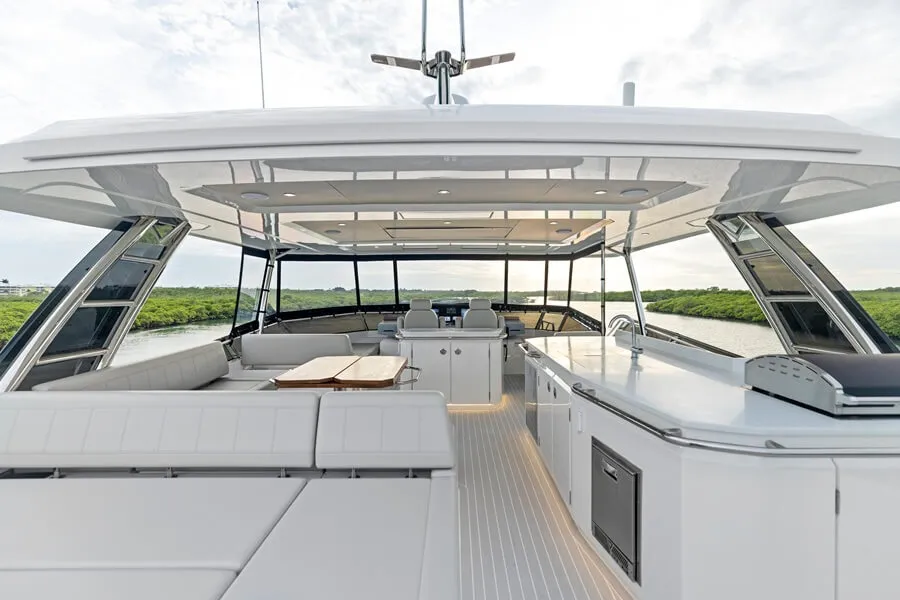 The hardtop, with solar panels on its rooftop, has isinglass (gelatin) that wraps around the large, 361sqft (33.4sqm) upper deck during inclement weather. That would likely be a fire-drill to set up in a