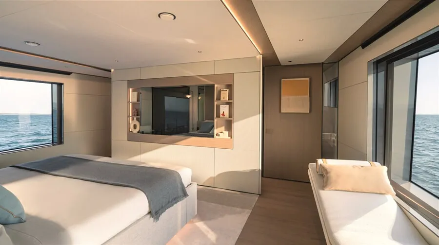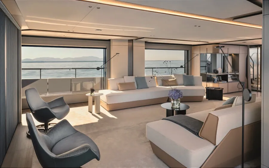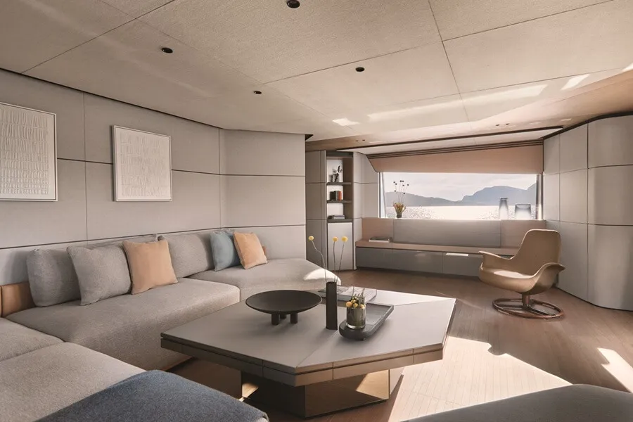 ‘Barefoot luxury’ is the theme of m2atelier’s designs for Azimut, which has described the new interiors as “a seamless fusion of sophistication and informality, tailored for a new wave of contemporary yacht owners”. However, according to m2atelier, light is the unifying language of this aesthetic philosophy, guiding perception and revealing depth.