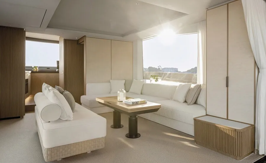 The interior is by Matteo Thun and Antonio Rodriguez, a Milan-based design studio and architecture firm experienced in shoreside properties. The Seadeck 6 was the team’s first foray into yachting, with Azimut tasking them to develop a slightly more evolved and mature style for the Seadeck 7.