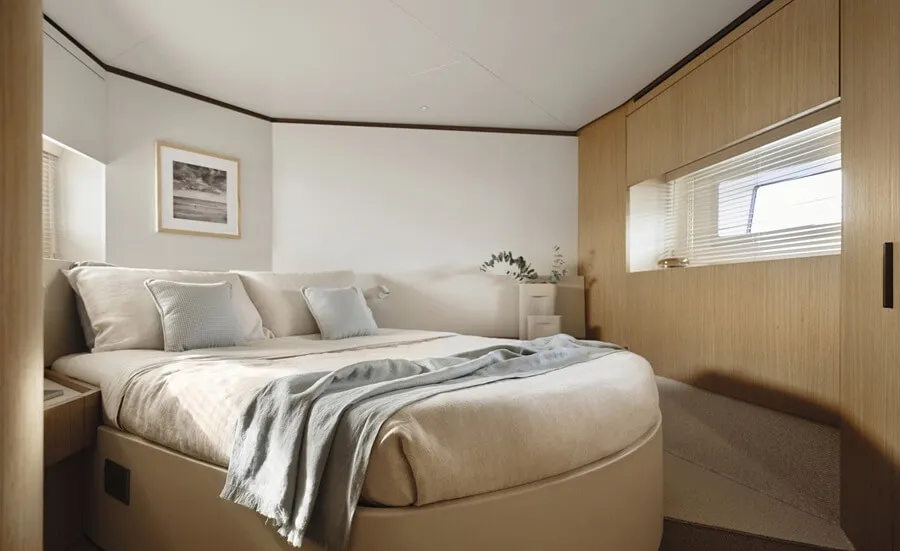 Key to the Seadeck Series is the commitment to eco-focused materials, evident in decks made from upcycled cork and carpets made from old fishing nets. Additionally, there’s a sense of harmony in the decor which comes with unique touches like custom-made wallpaper inspired by the design of the exterior decks. The galley is forward of the saloon, compactly tucked alongside the helm.