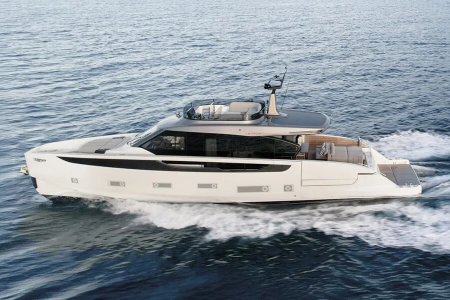 Alberto Mancini is to thank for giving this series such a recognisable look, toeing a fine line between sports yacht and cruiser. The result includes a high hull, plumb bow, pared-back wheelhouse and an elegantly swooped sheerline that meets the cockpit at the aft.