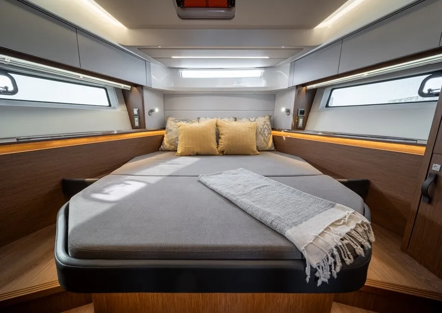 The outdoor areas include an aft cockpit covered by a hardtop overhang that can be fitted with solar panels or even a retractable canvas top. Shelter can be further expanded by an optional lateral canvas cockpit closing kit.