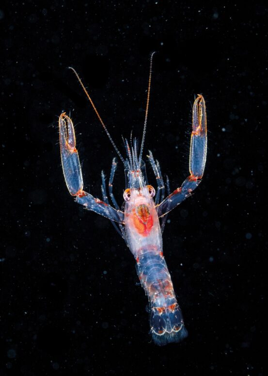 Among the most challenging modes of underwater macro photography, blackwater photography takes place in the open ocean typically deeper than 200m (where the epipelagic or sunlight zone ends), and involves tracking the vertical migration of plankton and other organisms, many smaller than a fingernail, that drift or dart as they travel upwards to feed at night.