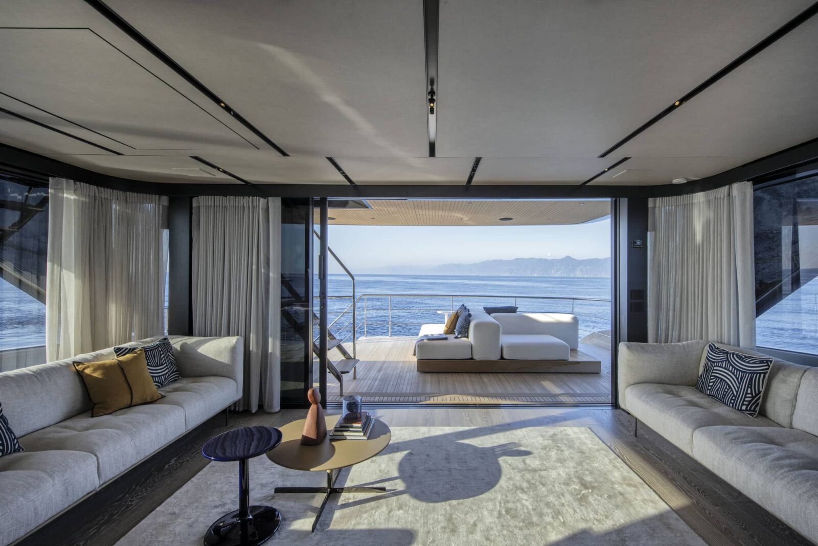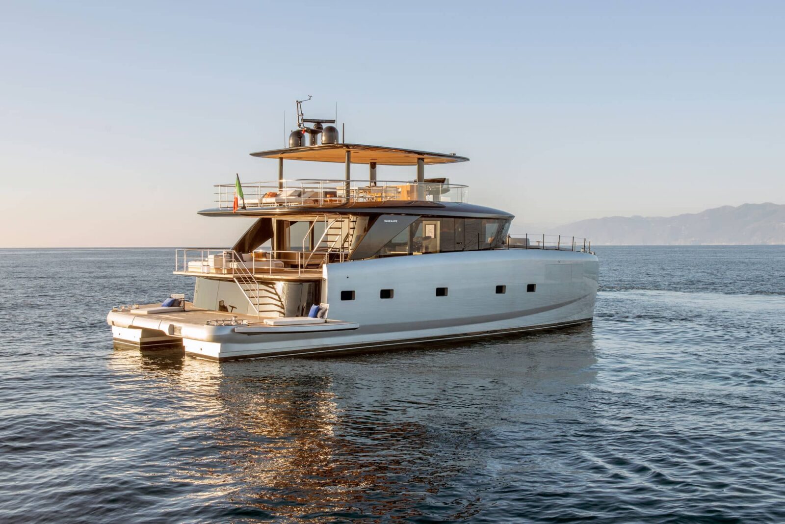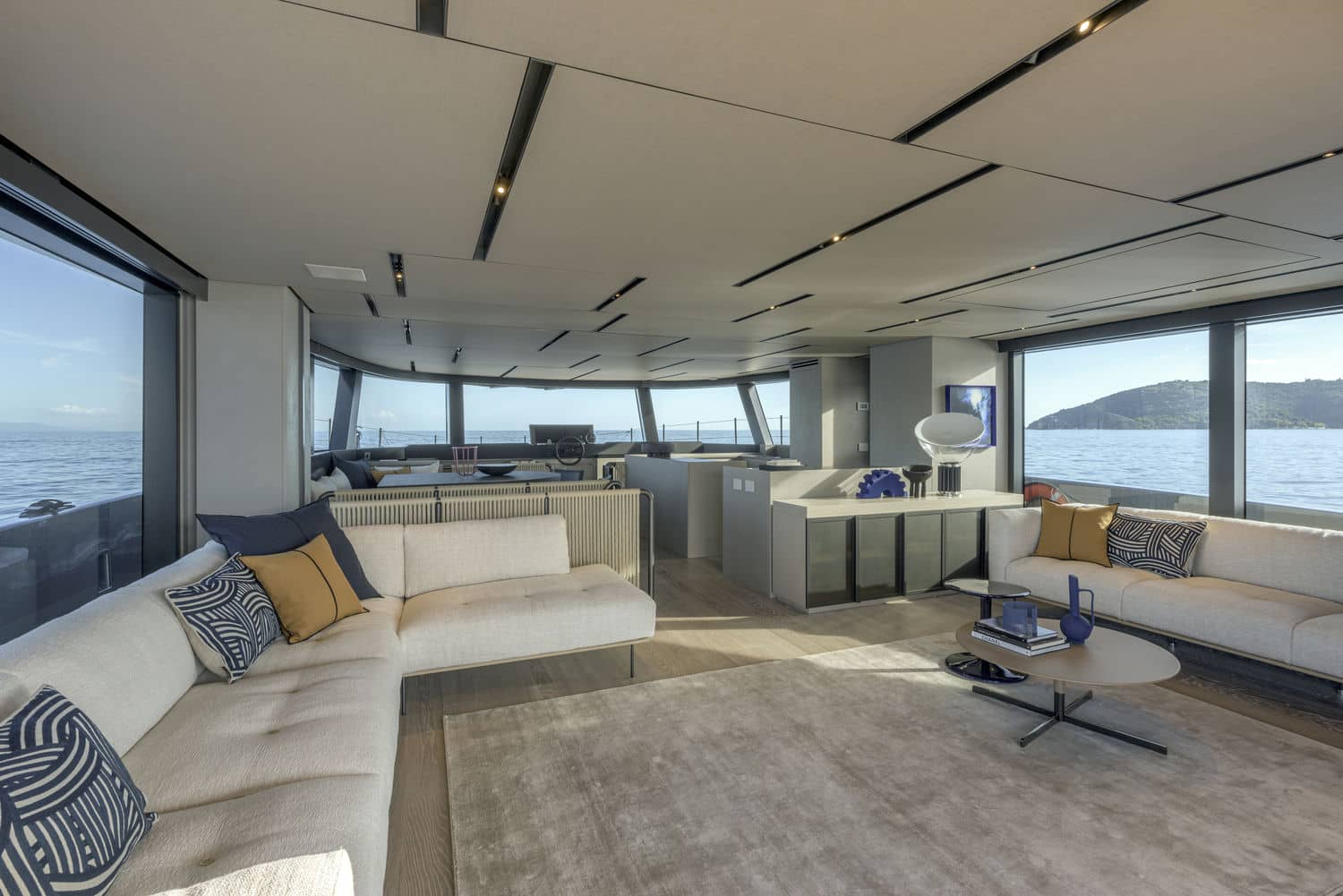 Bluegame’s first multihull, the BGM75 was designed by Bluegame’s Chief Designer Luca Santella and Bernardo Zuccon of Zuccon International Project. The BGM75 features a sleek profile and a generous 8.15m beam, as well as folding aft terraces that add 2m to the width. The model offers 50 per cent more room than a monohull of the same length, according to the Sanlorenzo-owned brand.