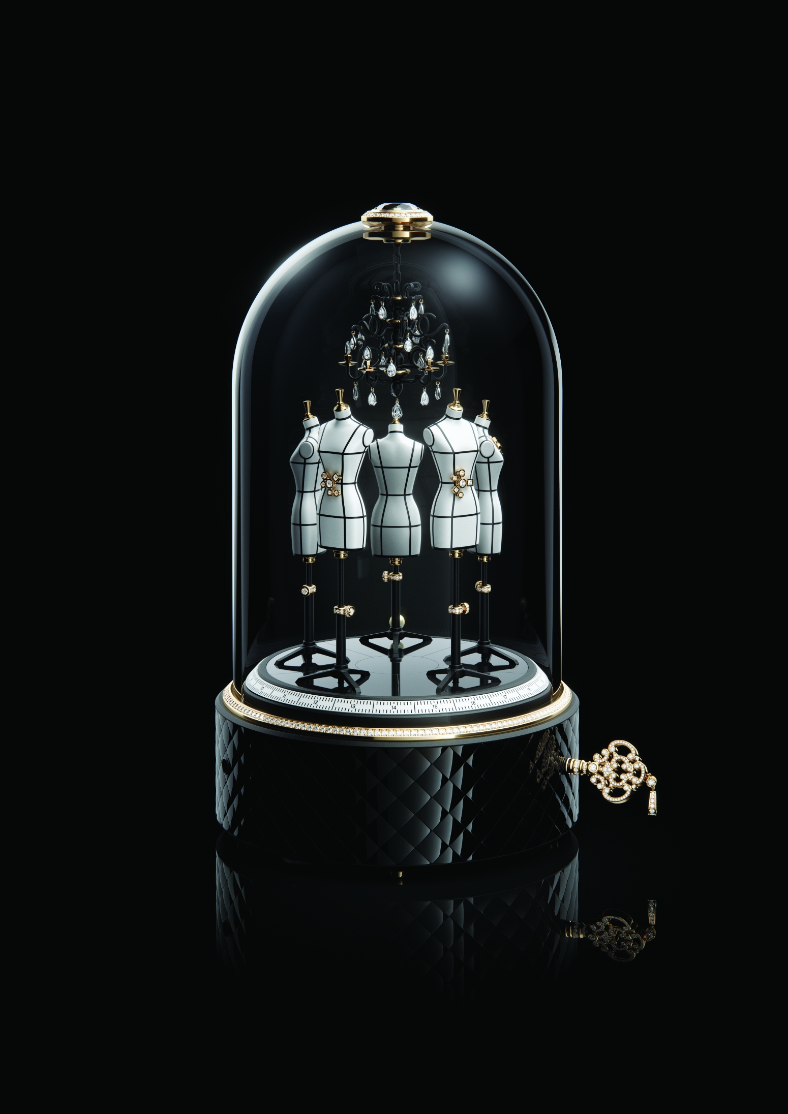 The inspiration for this unique piece was the lively atmosphere in Chanel’s rue Cambon atelier. Hence, a series of five couture busts stand tall on the surface of the base while hanging overhead is a miniature chandelier set with diamond droplets. When activated, these busts dance to the rhythm of “My Woman” by Al Bowlly, a melody that Mademoiselle Coco Chanel reportedly loved to hum while working.