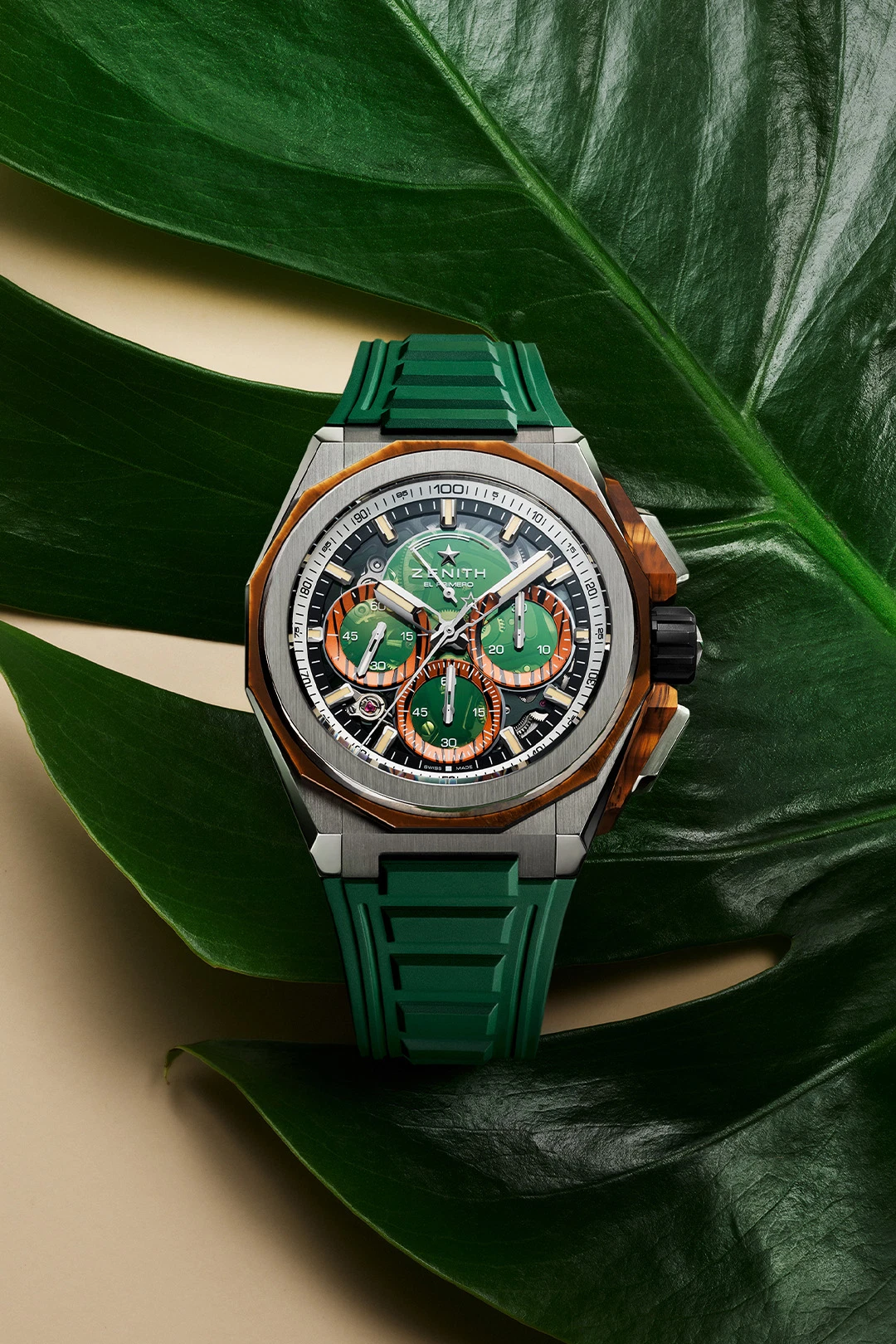 The most recently launched DEFY Extreme Jungle houses the same El Primero Calibre 9004, albeit in a different case execution. The monolithic design makes way for an expressive design reminiscent of jungle scapes with a green and brown colour combination. Part of the collection’s allure is incorporating exotic materials into the case structure, which sees the dodecagonal bezel and pusher protectors fashioned from precious tiger’s eye quartz. While the burly 45mm timepiece might seem like a wrist weight, its titanium case significantly reduces heft without compromising robustness and toughness.