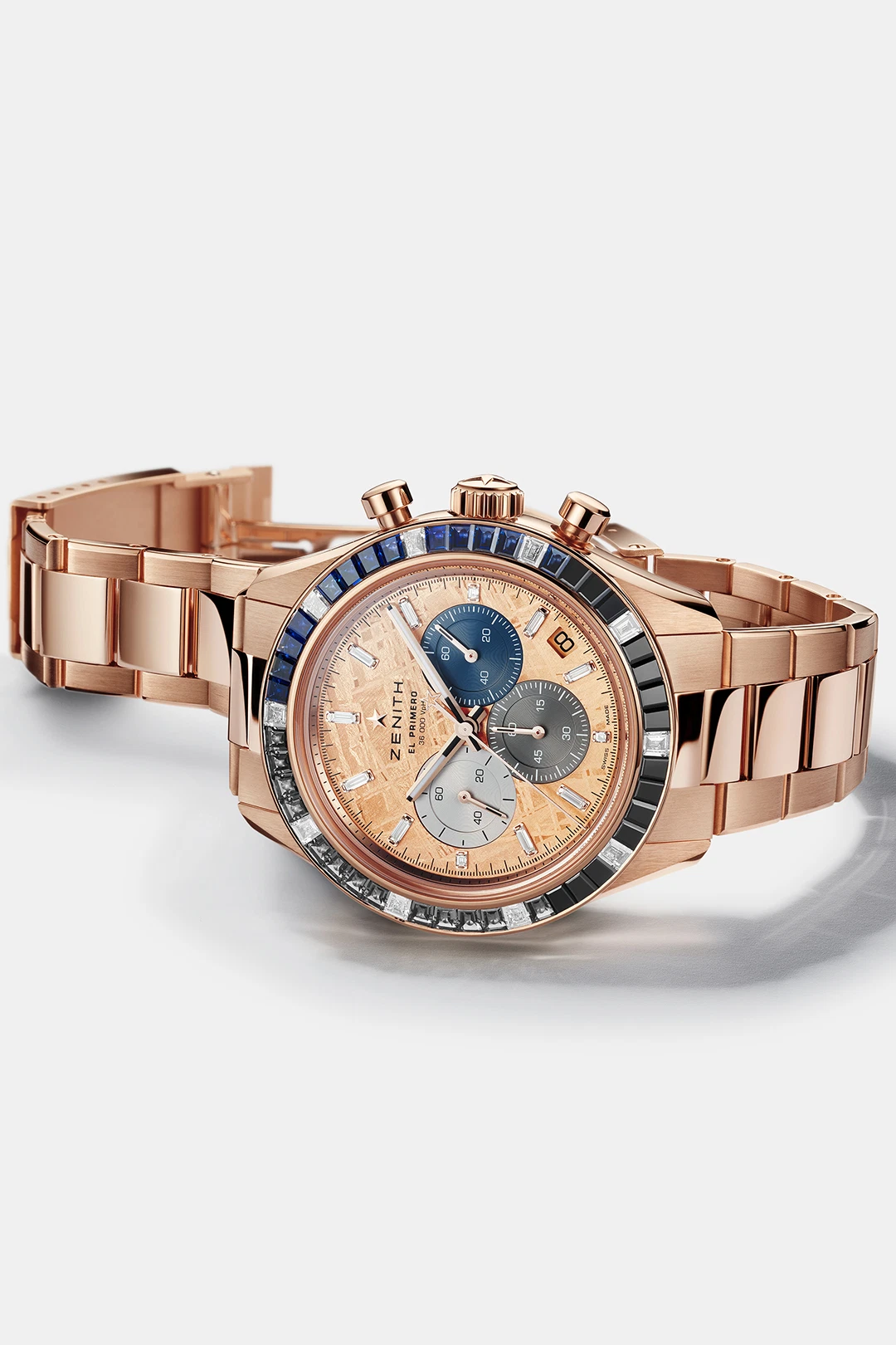The Chronomaster Sport Green Dial is a vibrant tribute to Zenith’s pursuit of precision. Its striking green ceramic bezel and matching lacquered dial are paired with the iconic tricolour counters in shades of grey and blue. Whether the watch is fitted on the classic steel bracelet or the green rubber strap, this sporty yet refined chronograph is ideal for those who appreciate precision and performance​ in one compelling watch. For those seeking the extraordinary, the gem set Chronomaster Sport redefines opulence. A rose gold case adorned with baguette-cut diamonds, sapphires, and spinels and a meteorite dial bring celestial sparkle to your wrist.
