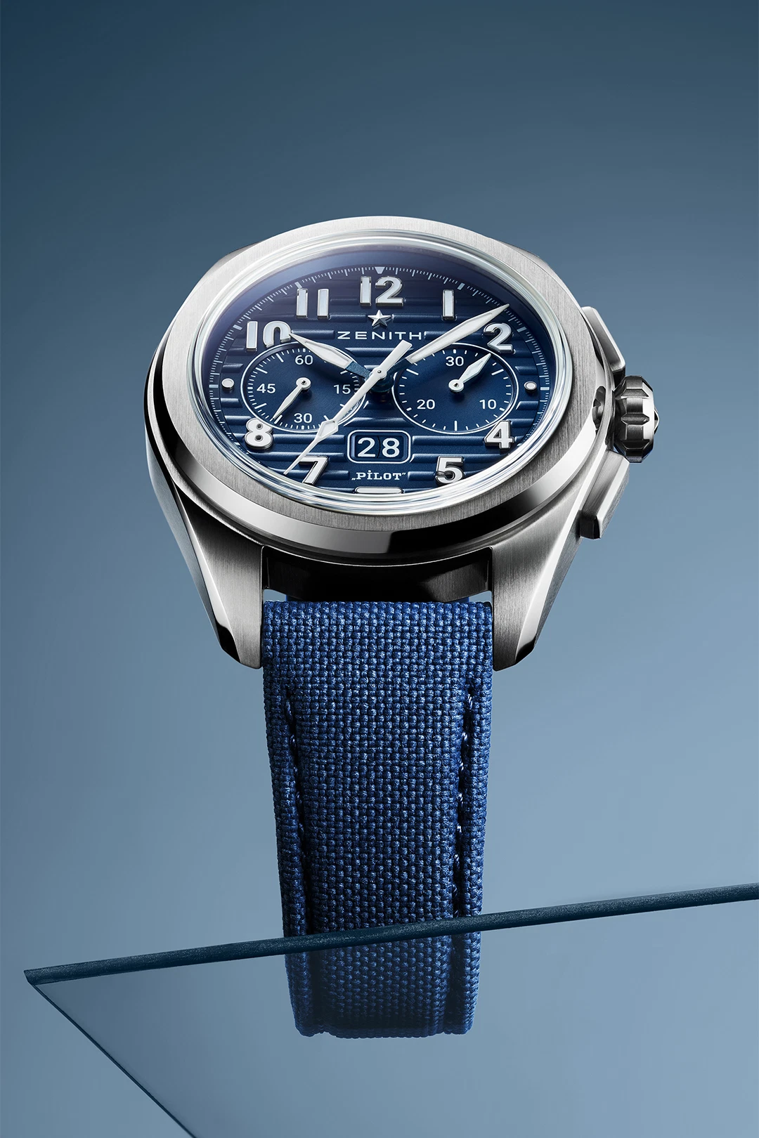 Blue is one of Zenith’s signature colours, and it only fits that the boutique exclusive Pilot Automatic, imagined for the skies and horizons, comes in a deep blue dial. The revamped Pilot collection sees all but one detail changed: the “Pilot” signed dial, which only Zenith holds the right to mark its dials with the term. Apart from that, the telling differences include a rounded stainless steel case with a flat-top round bezel and a corrugated-inspired grooved dial with a big date. The patented complication is powered by the El Primero 3652, which is geared to allow the date change to jump and stabilise within 0.007 and 0.02 seconds, respectively.