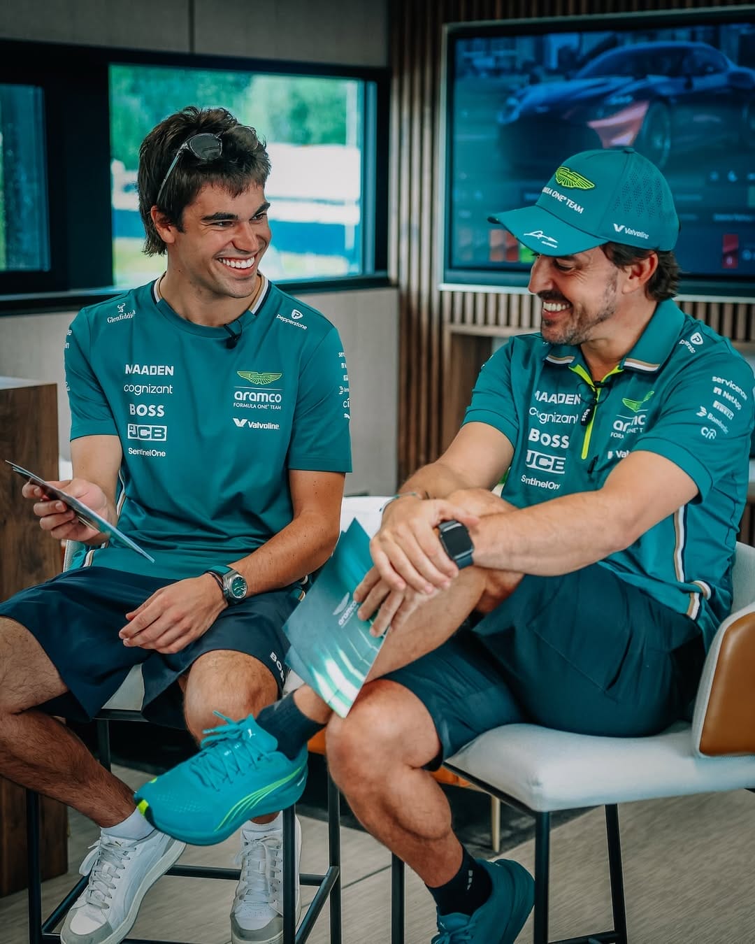 Lance Stroll is beaming at Fernando Alonso and thinking, “why does he not have to wear team watch?”