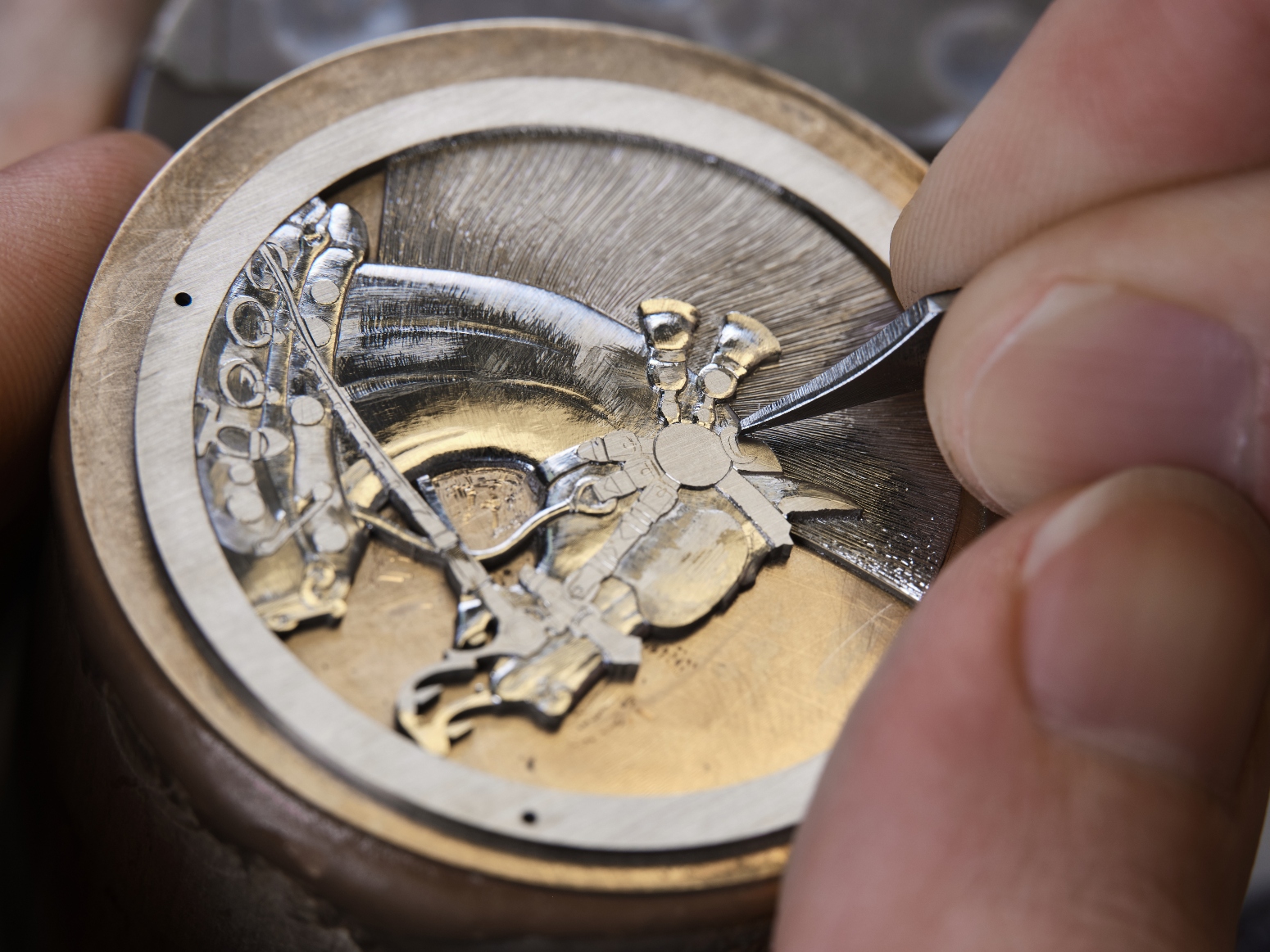 The final technique here is Cartier’s enamel granulation, which combines enamelling with Etruscan granulation originally used by goldsmiths. The craft requires multiple steps and is extremely tedious, to say the least. Enamel is first worked into threads of different diameters, before these threads are chipped off bit by bit to form beads of various sizes. The beads are then sorted by colour and applied to the dial successively to assemble an image, with intermediate firings to set and fuse the enamel. As different colours of enamel fuse at different temperatures, there is a clearly-defined order for the assembly process; up to 30 firings are necessary, and each dial requires nearly a month to complete. Like shaded enamel, enamel granulation is a very recent development, and Cartier is reviving it in its Maison des Métiers d’Art in La Chaux-de-Fonds.