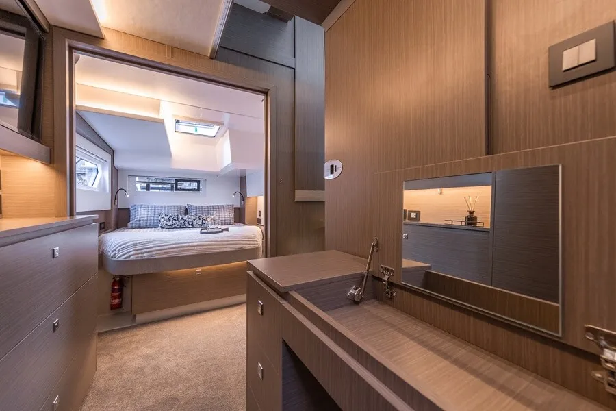 In the five-cabin version, there is an extra stateroom with bunks to starboard near the middle of the boat. Moreover, there is an option for a utility room in the port hull forward cabin that’s equipped with washer and dryer, as well as extra storage space. There are plenty of opportunities for owners to choose their desired configuration.