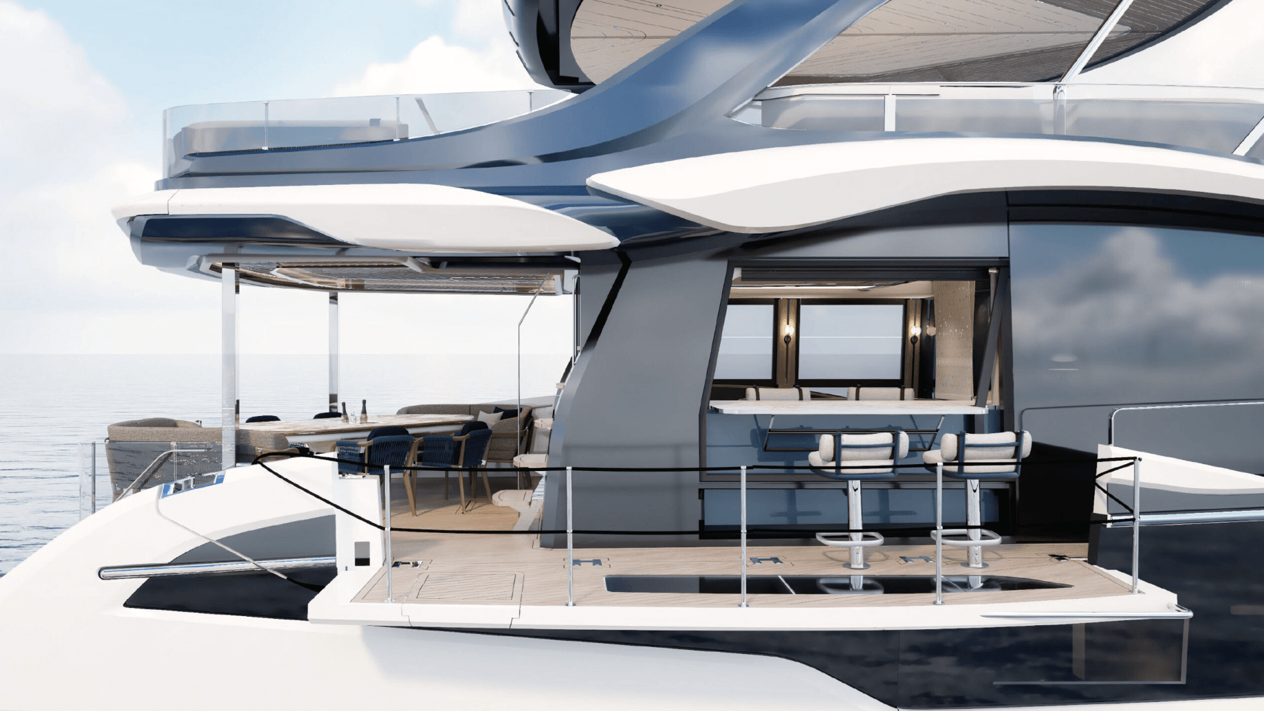 The main deck has an asymmetrical layout, with only a full side deck to starboard, where the drop-down balcony can create a bar over the water once stools are installed.