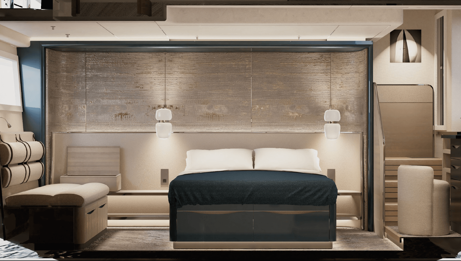 The large port beach platform can even be accessed by a door from the full-beam master suite, which enjoys an open view of the water and direct sea access. The starboard beach platform is slightly thinner, but still completes a three-sided beach area by the water.