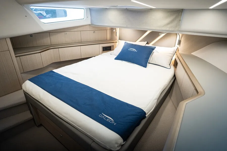 Below deck, the master cabin located in the bow offers a comfortable double bed and ample storage space. Enhanced natural light fills the interior, courtesy of oversized windows, a ceiling skylight and dispersed LED illumination.