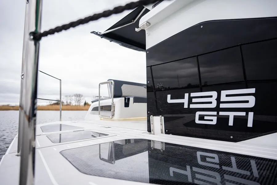 The two-cabin 435 GTI is a fine performer, and can reach in the region of 38 knots with two 480hp Volvo Penta IPS650 engines, and top 40 knots with the 600hp IPS800 options. There’s even a four-engine option available, with each one limited to 500hp.
