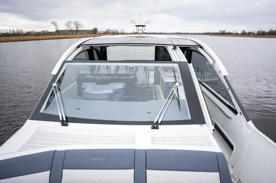 The 435 GTI’s two-tone exterior boasts full-length windows and partially glazed balconies complemented by striking sporty details. The Tony Castro studio, which has been designing for Galeon since 2001, created a climate-controlled wheelhouse in wraparound glass to offer unobstructed, panoramic views while protecting the passengers from the elements.