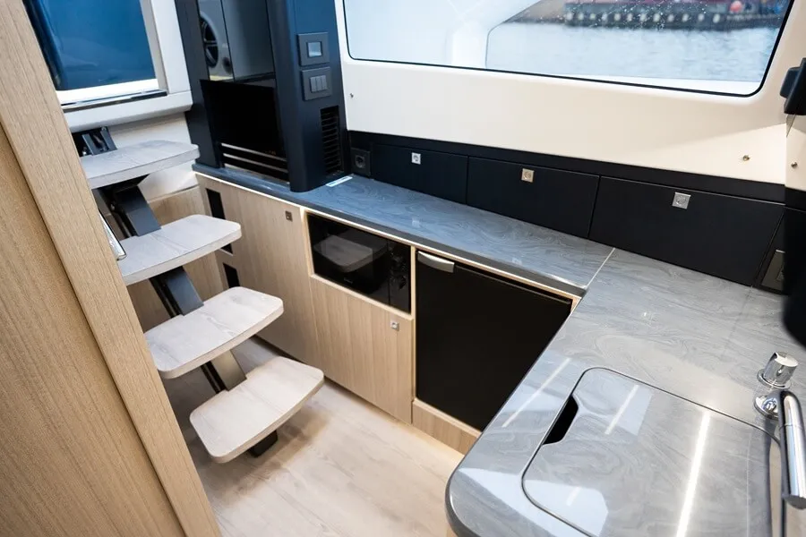 The finely appointed galley area boasts ample storage and plenty of headroom, ensuring easy access to both guest cabins. The bathroom is equipped with upscale cabinetry and a walk-in shower – a neat, well-organised environment. All lower-deck areas are illuminated by recessed LED lighting.