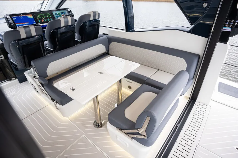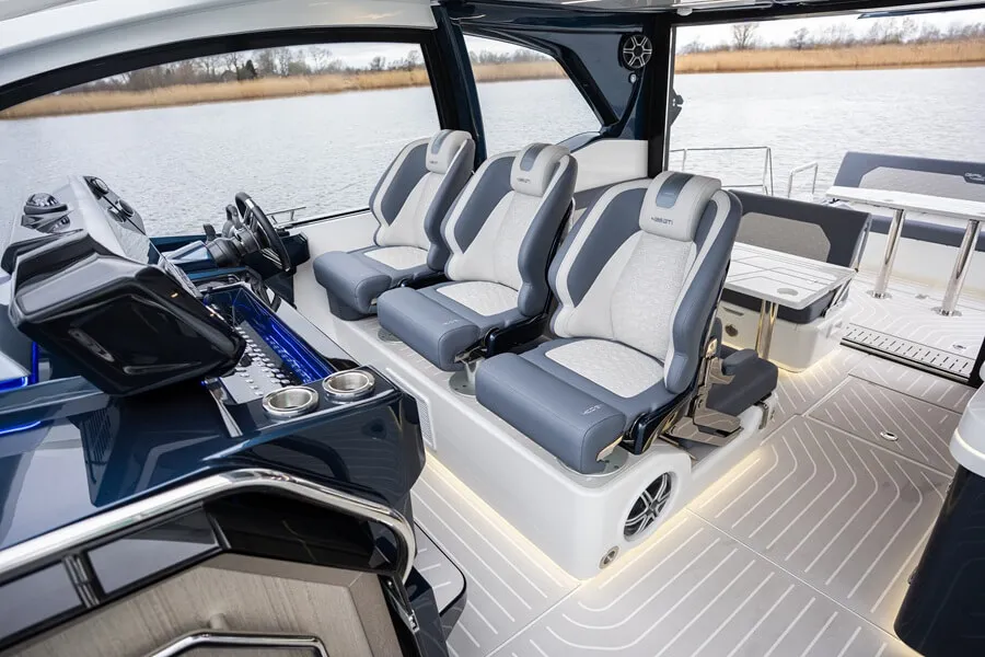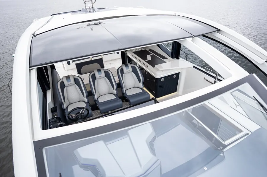 The surprisingly spacious interior of the main deck features a U-shaped dining area, a wet bar area with fridge and sink, and three sporty helm seats – all under a large, two-section opening sunroof, with side windows that lower to allow in fresh breezes and natural light.
