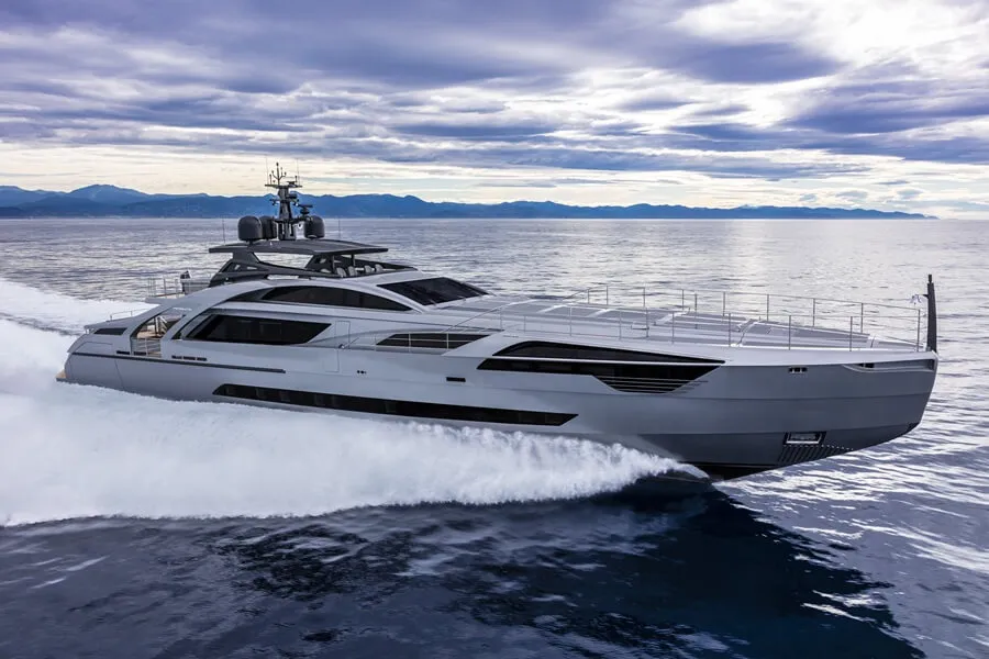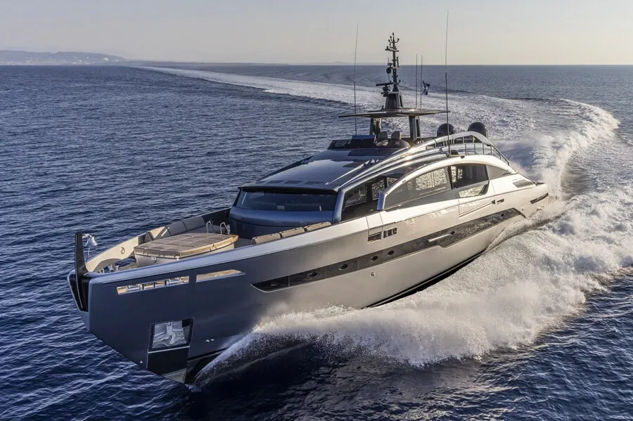 Pershing is a world leader in using surface-piercing propeller systems for recreational boats and has been using waterjets with gas turbine propulsion since the first Pershing 115 was launched in 2004. The model was the shipyard’s first 30m-plus yacht and had a sleek, aggressive and aerodynamic profile.