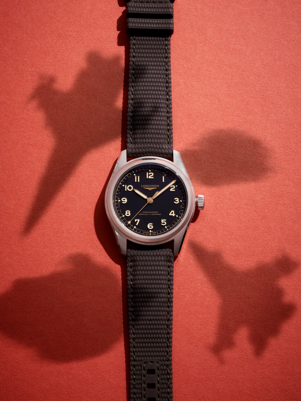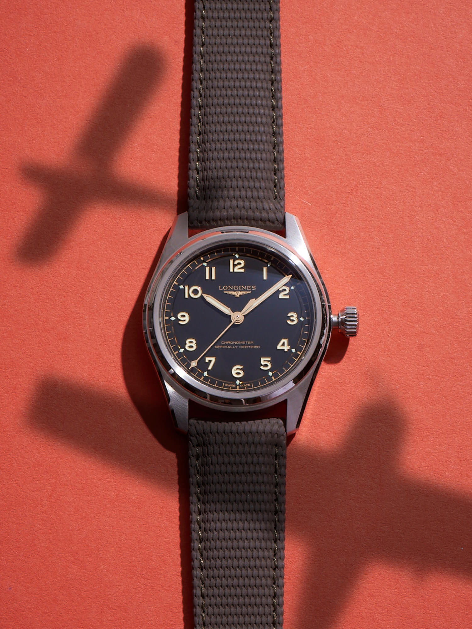When discussing travel and flight at Longines, it is natural to include the chronograph lineage that made the brand a reference point for timing. Yes, longtime readers may recall we promised to address this point after our chronograph special two years ago, and here it is! In 1913, Longines introduced the 13.33Z, one of the first chronograph movements designed for the wrist. It brought the stopwatch out of the pocket, into the cockpit and onto the officer’s sleeve (early models were all designed to be worn over jacket sleeves, which pilots had to keep on to protect them from the elements). The movement beat at 18,000 vibrations per hour, offered a 30-minute elapsed time counter, and used a monopusher control through the crown or an integrated button. It proved that a compact wrist chronograph could deliver the precision required by professionals.
