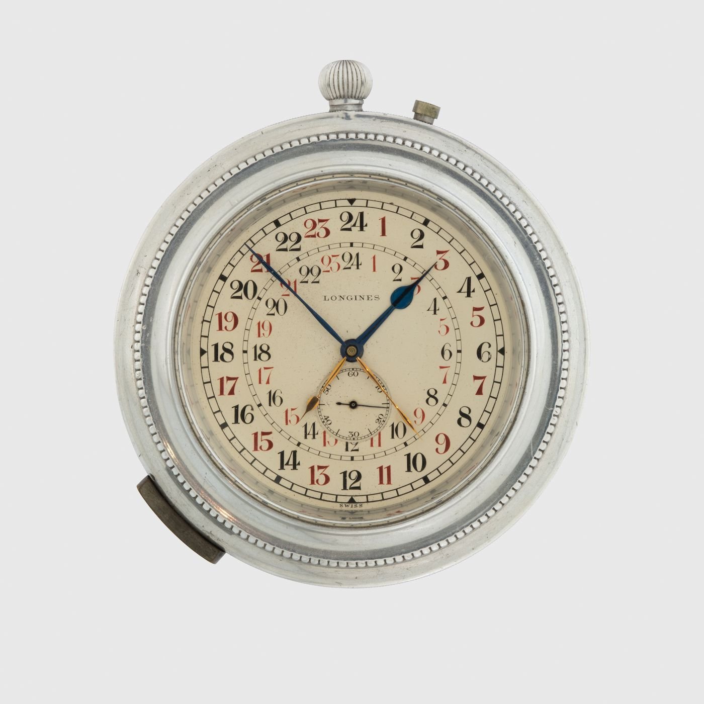 By 1930, Longines was producing cockpit clocks with dual hands and 24-hour dials. One of these instruments accompanied the aviators Clyde Pangborn and Hugh Herndon on their daring nonstop Pacific crossing in 1931. Cockpit clocks were often equipped with pushers that allowed precise synchronisation to radio time signals. Accuracy was not a matter of luxury in this environment. It was the difference between a safe approach and a dangerous error when calculating position by dead reckoning (a method of navigation relying on estimating one’s current track, groundspeed and position based on earlier known positions). These cockpit instruments and Zulu Time wristwatches share a design philosophy: both treated time as a navigational tool rather than an elegant display.