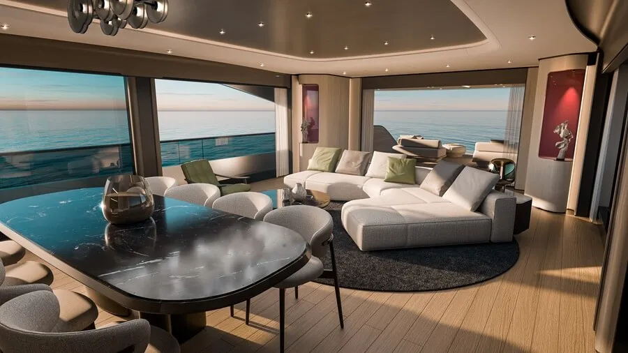 The saloon features sliding side doors that open the inside to the outside, while the full-beam owner’s suite features expansive windows.