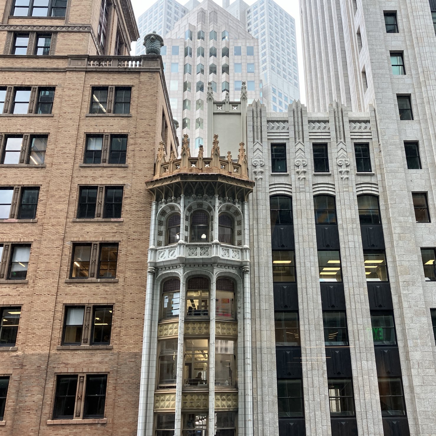 Sandwiched between the Adam Grant Building (left) and the Shell Building (right), the Heineman Building is the narrowest building in San Francisco, measuring only 20 feet wide and 80 feet deep. Designed by the Heineman brothers, its Art Nouveau detailing makes it a unique contribution to the city’s architectural diversity. Despite its petite size, the building packs intricate craftsmanship into every corner, from its ornate ironwork to the carefully designed windows that reflect the period’s emphasis on decorative design.