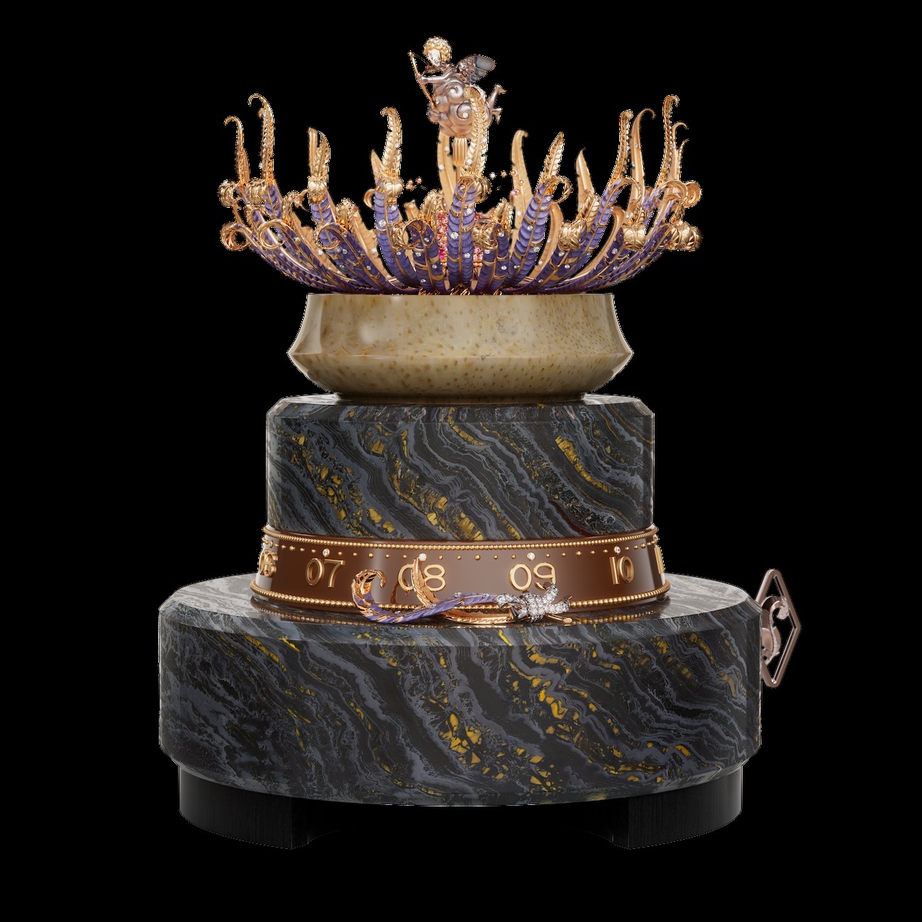 For the first time, the brand has worked with petrified palmwood for the base. It holds a basket of precious flowers, which opens to reveal Cupid, who has been realistically depicted in white, rose, yellow gold, diamonds and sapphires. His wings are rendered in an ethereal plique-a-jour enamel, a notoriously challenging technique to master. The rise of the column is accompanied by the gentle chime of a carillon, as Cupid flutters his wings and pirouettes amidst a flurry of clouds, rendered in white gold, diamonds, and pink sapphires in three delicate shades.