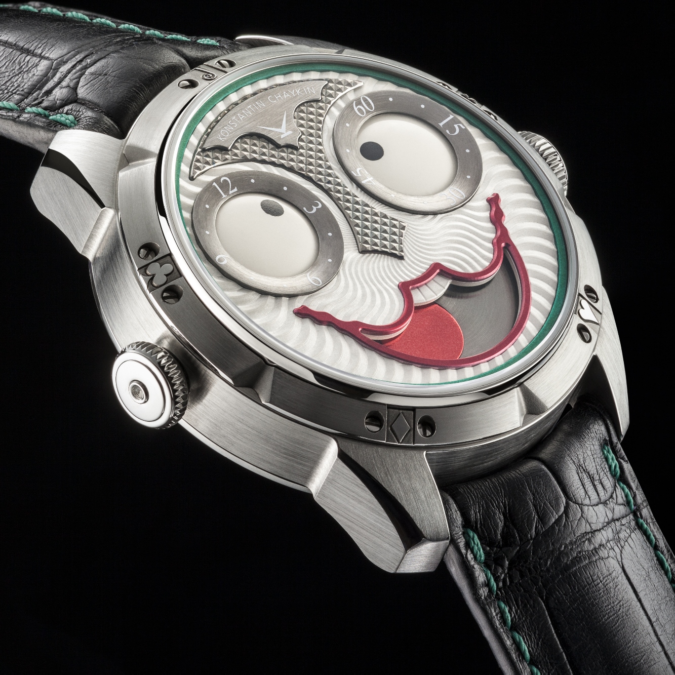 The Konstantin Chaykin Joker watch is a striking example of how traditional horology can be reimagined to challenge conventional perceptions of timekeeping. This avant-garde timepiece transforms the dial into a dynamic, expressive visage reminiscent of a theatrical Joker, where time is communicated through playful yet intricate mechanical artistry. At the heart of the design lies a clever double-disk system: the watch’s “eyes” serve as hour and minute indicators, rotating independently to convey the passage of time, while a crescent-shaped moon phase indicator forms the Joker’s ever-changing smile. This integration of functional elements into a vivid, emotive face creates a constantly shifting expression that reflects not only the hours and minutes but also lunar cycles — injecting an element of unpredictability and spontaneity into time-telling.