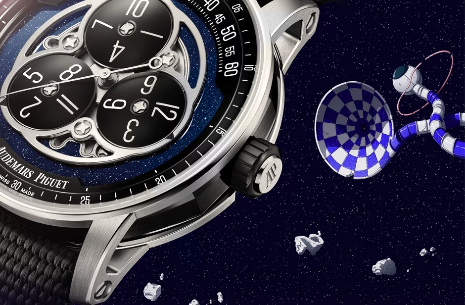 Audemars Piguet’s Code 11.59 Starwheel revives the centuries-old “wandering hours” complication, a unique horological innovation dating back to the 17th century. Instead of traditional hands, time is conveyed through three rotating discs that orbit along a minute scale, offering an enchanting and unconventional way to read hours and minutes.