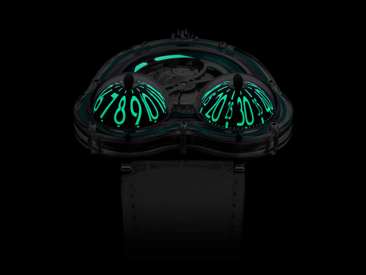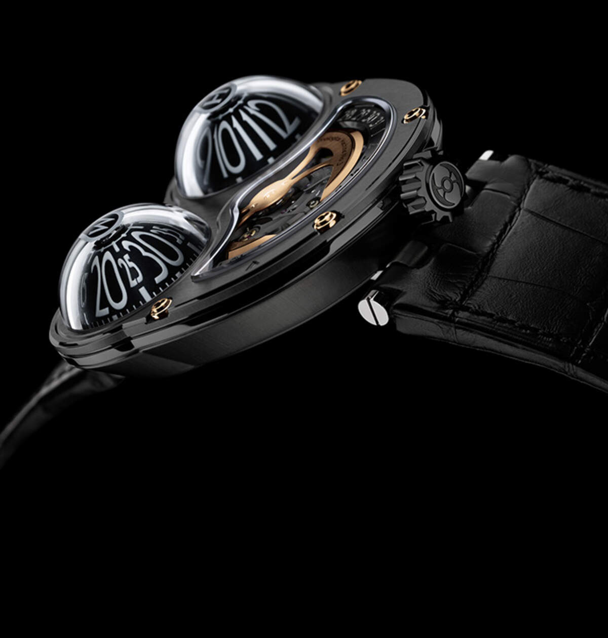 At the core of the watch is a movement conceived by master watchmaker Jean-Marc Wiederrecht, based on a Girard-Perregaux calibre that has been ingeniously inverted. This unusual orientation places the oscillating balance wheel and the oversized 22k gold and titanium winding rotor on the uppermost surface, giving the wearer full visibility into the engine’s rhythm. However, flipping the movement created a new technical challenge: how to transmit energy to the time display located at the top of the watch. MB&F resolved this with a re-engineered vertical gear train, avoiding bulky mechanisms and keeping the profile wearable despite the complexity.