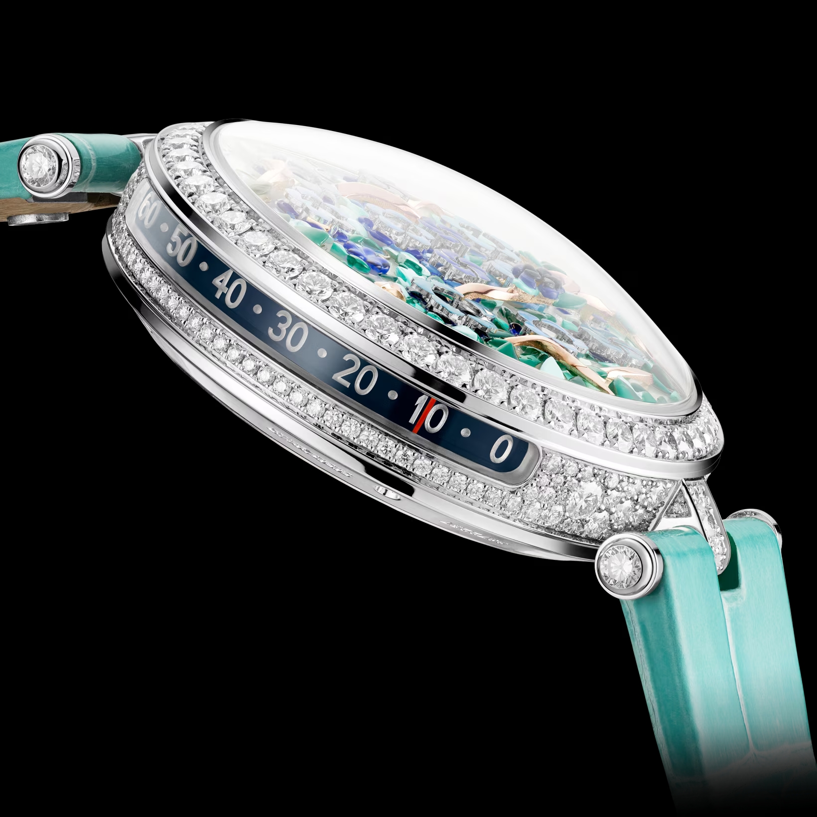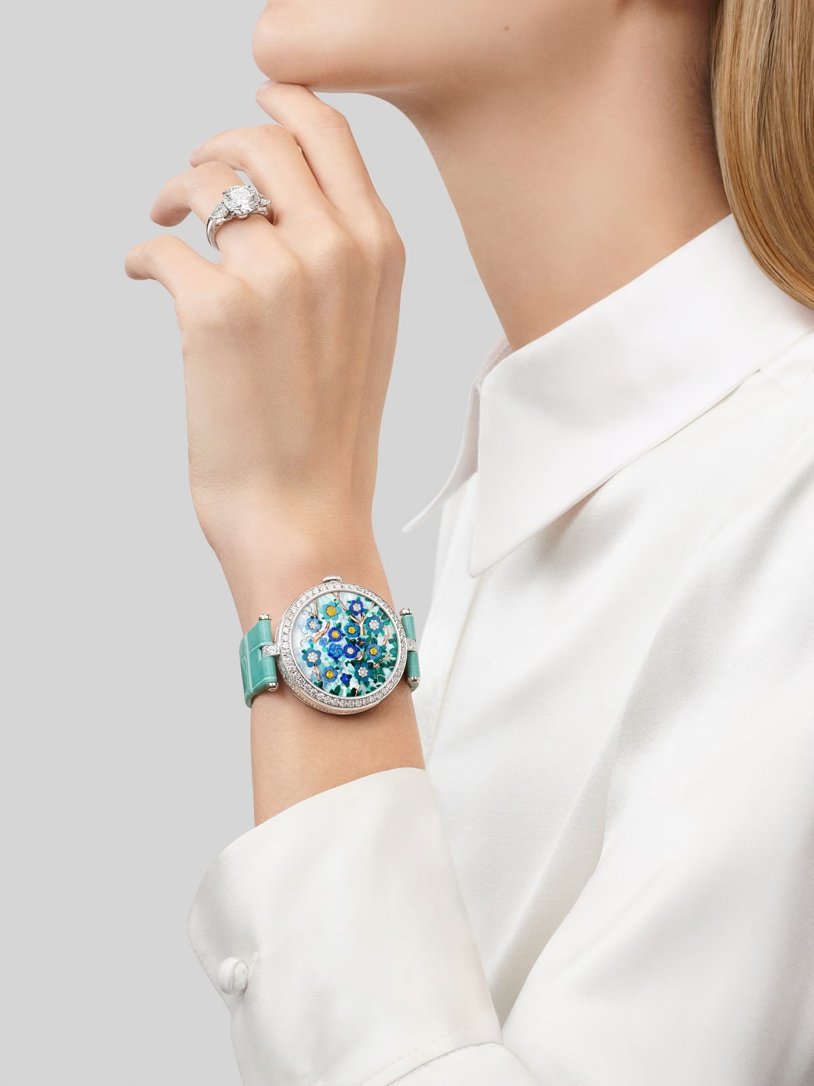 Van Cleef & Arpels continues its tradition of poetic horology with the Lady Arpels Heures Florales, a timepiece that transforms the perception of time through nature’s rhythms. Drawing on the 18th-century concept of Carl Linnaeus’ “Horologium Florae” — where specific flowers open and close at certain hours of the day — this watch replaces hands with a floral animation that visually “blooms” to indicate the hour. Each passing hour is marked not by mechanical precision alone but by the organic unfolding of 12 meticulously crafted flowers, each delicately opening in sync with time. The minute display is positioned laterally, subtly preserving technical functionality while prioritising a sensory and emotional reading of time. This unique complication — powered by a custom mechanical movement developed in Valfleurier — elevates the experience into something akin to observing nature in motion.